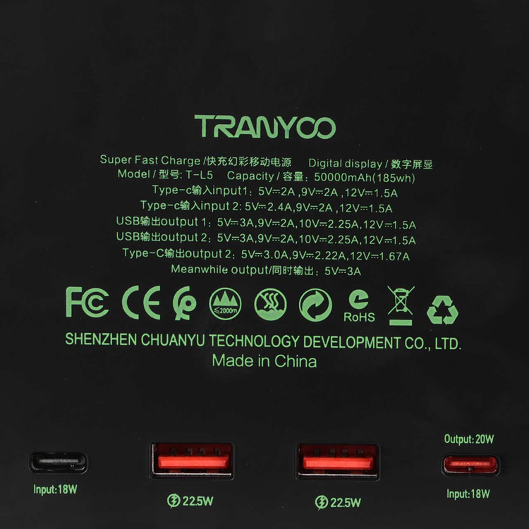 USB : 5V/3A - 9V/2A - 12V/2.25A - 12V/1.5A - Type-C : 5V/3A - 9V/2.22A - 12V/1.67A